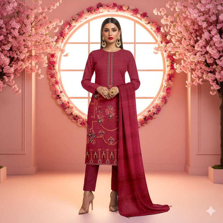 Step Into Seasonal Charm With This Unstitched Plan Embroidery Chamki Dhanak 3-Piece, Created To Offer A Perfect Balance Of Comfort And Contemporary Style. The Premium 2Head Embroidered Chamki Dhanak Shirt Features A Vibrant Digital Print That Radiates Freshness And Elegance. A Coordinated Premium Printed Dhanak Velvet Shawl Adds Graceful Flow, While The Dyed Dhanak Trouser Ensures Durability And Comfort. Ideal For Daywear, Casual Events, Or Festive Gatherings, This Ensemble Gives You The Freedom To Stitch A Look That Reflects Your Personal Fashion Sense.